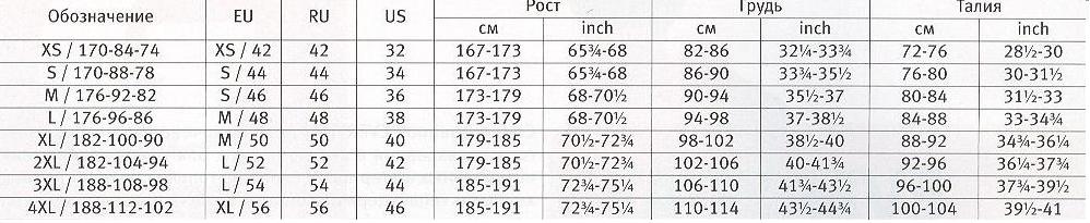 Таблица размеров мужского термобелья