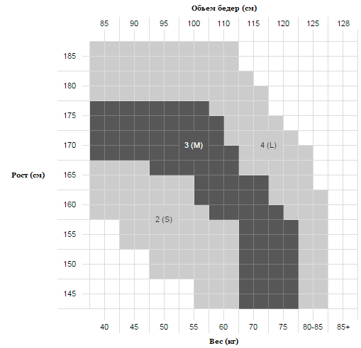 Чтобы определить свой размер, нужно найти точку пересечения Вашего роста и веса.