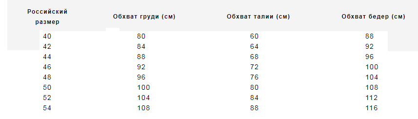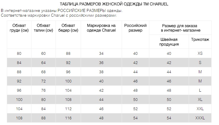 Таблица размеров одежды Charuel